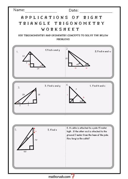 The Metric Relations in a Right Triangle Worksheet is designed to help students understand the metric relations of a right triangle. This worksheet provides students with a visual representation of the relationships between the lengths of the sides of the triangle, as well as the angles. Students can use the worksheet to practice solving equations and problems involving right triangles. The worksheet also provides students with practice in solving problems involving other shapes, such as squares and rectangles.